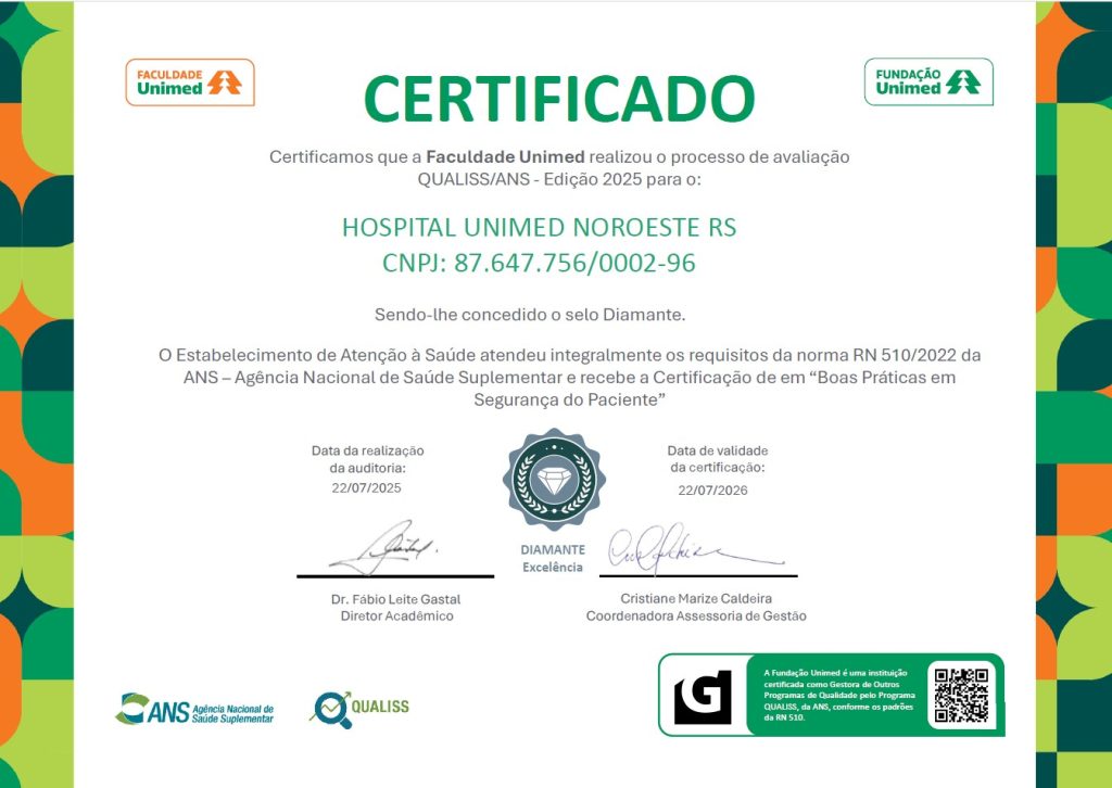 A certificação foi obtida após auditoria presencial realizada na instituição, com validação técnica e emissão oficial do certificado. O reconhecimento confirmou a maturidade dos processos assistenciais e o compromisso com um cuidado seguro, qualificado e centrado no paciente. O Selo Diamante representa a consolidação de uma cultura organizacional orientada à excelência, à gestão de riscos e à melhoria contínua da assistência.