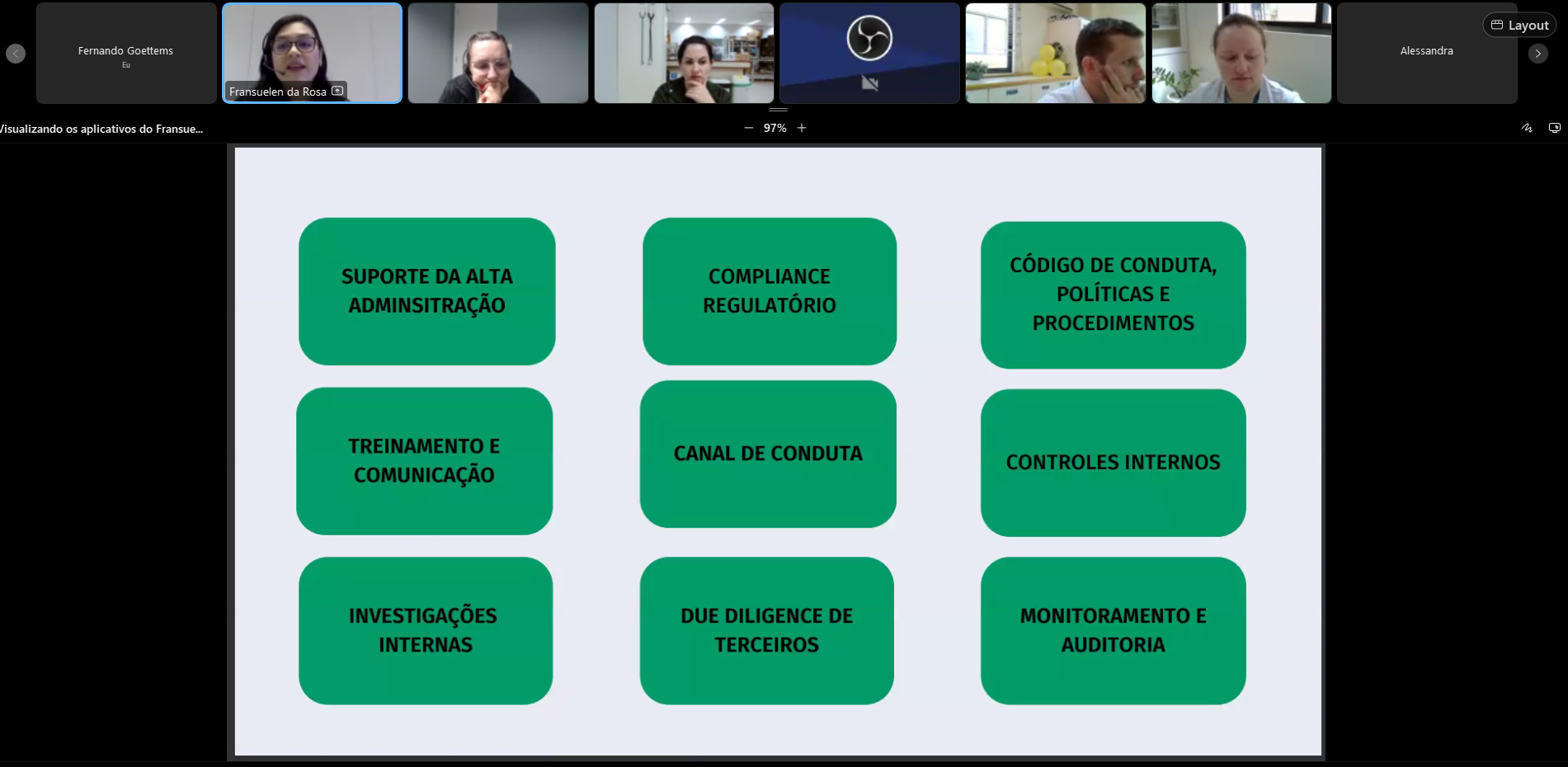 Encerrando o ciclo de palestras, na quarta-feira, 16, Fransuelen Silva da Rosa, coordenadora de Governança e Conformidade da Unimed Noroeste/RS, apresentou “O Programa de Compliance da Unimed Noroeste/RS”. Ela detalhou o funcionamento e a importância da iniciativa para a integridade e a sustentabilidade da cooperativa.