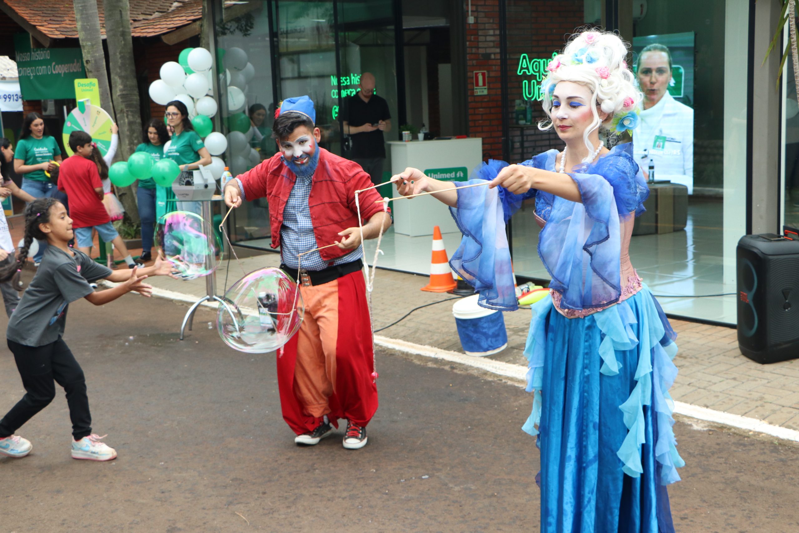 Dia das Crianças – Com seu Jeito de Cuidar, a Unimed Noroeste/RS também celebrou o Dia das Crianças com uma tarde repleta de sorrisos e encantamento na feira. A programação envolveu as famílias em um ambiente acolhedor, com muita diversão e brincadeiras que resgataram a magia da infância. A atividade contou com a participação de integrantes do grupo Cir.Art, que encantou o público com bolhas de sabão e interações. As crianças ainda participaram de desafios, incentivando hábitos saudáveis e momentos de convivência que reforçam o valor do brincar.
